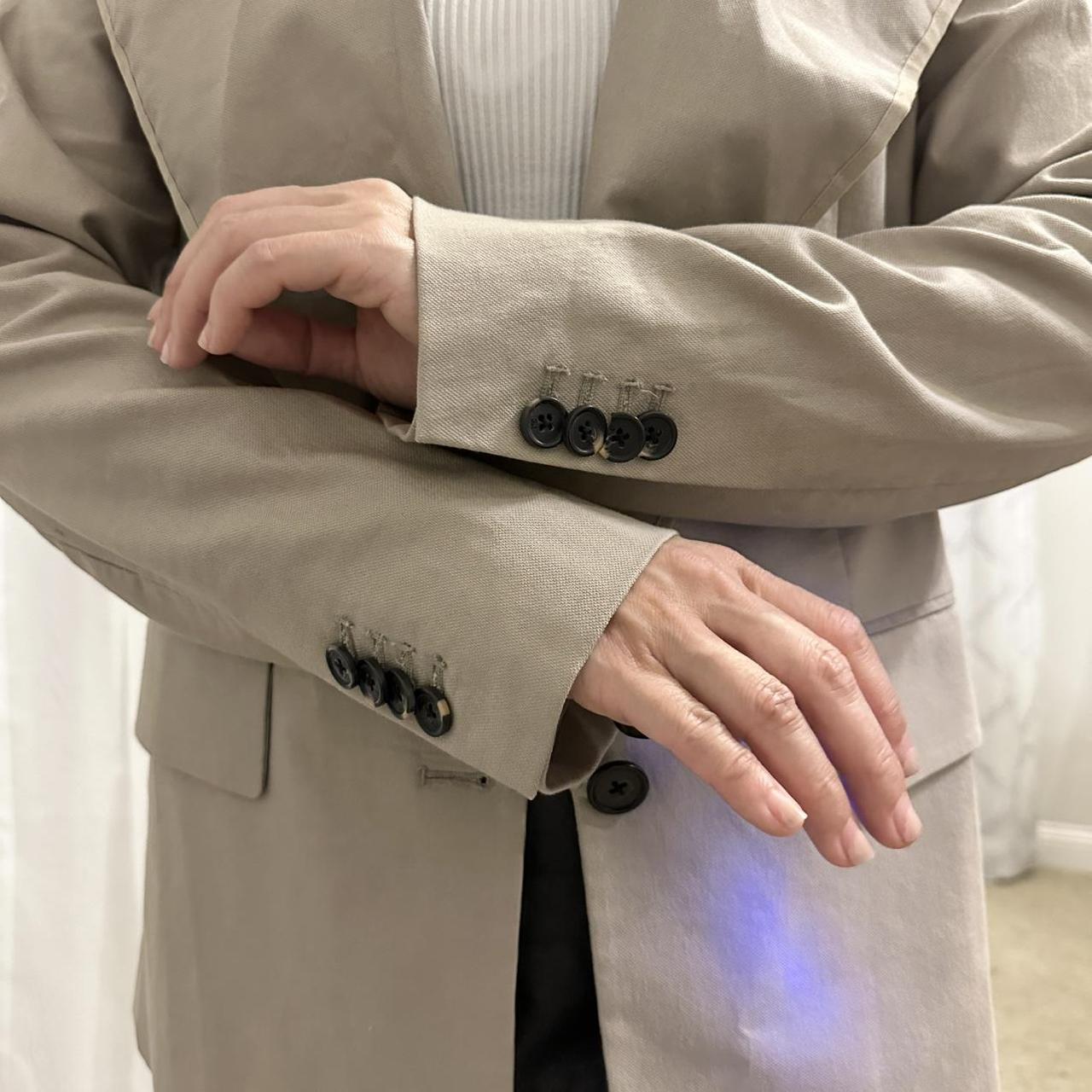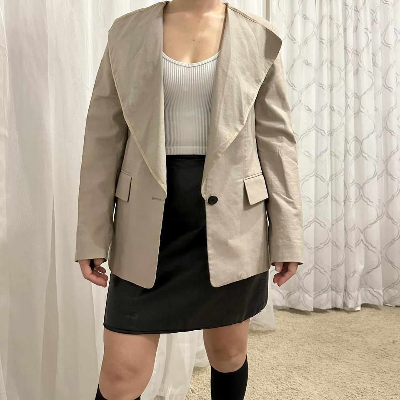 Light weight designer jacket with accented big collar, in a khaki color with black buttons. 100% cotton.