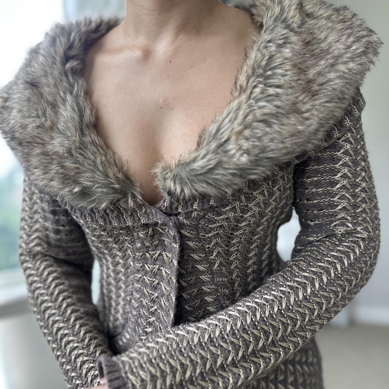 Muted taupe brown and khaki knitted cardigan with detachable faux fur collar.