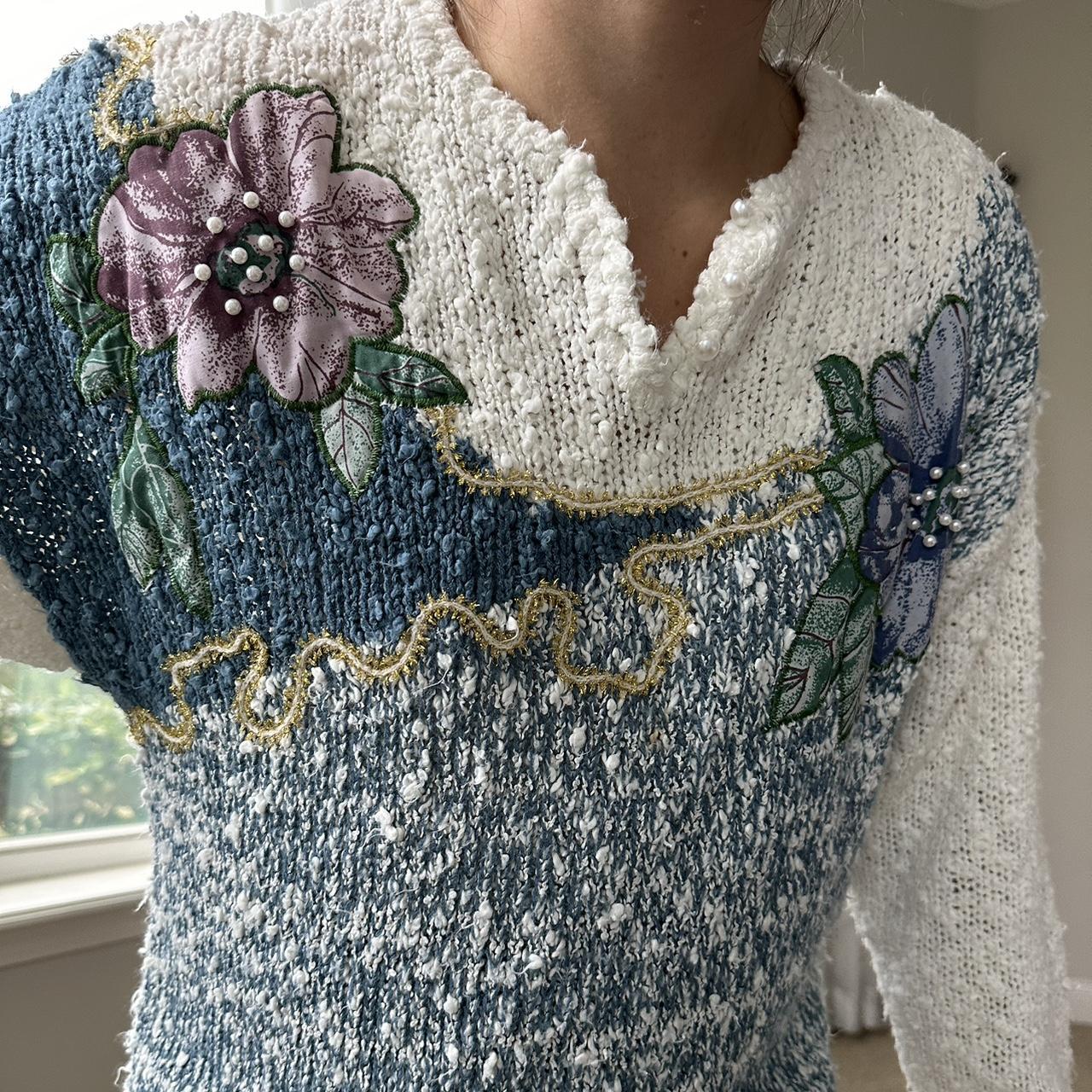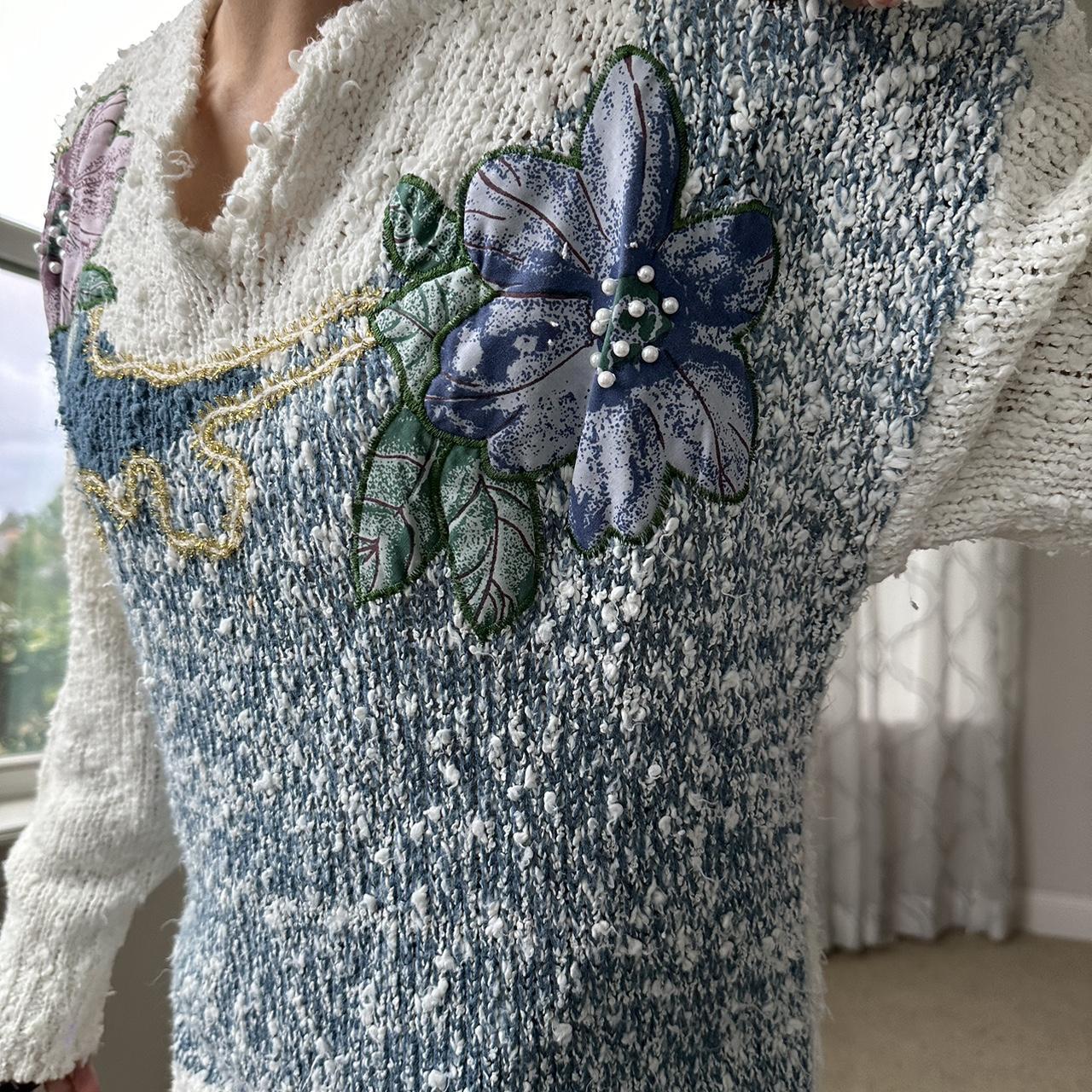 White terry teddy type textured sweater with patchwork of florals. Accented with pearl type button closures.
