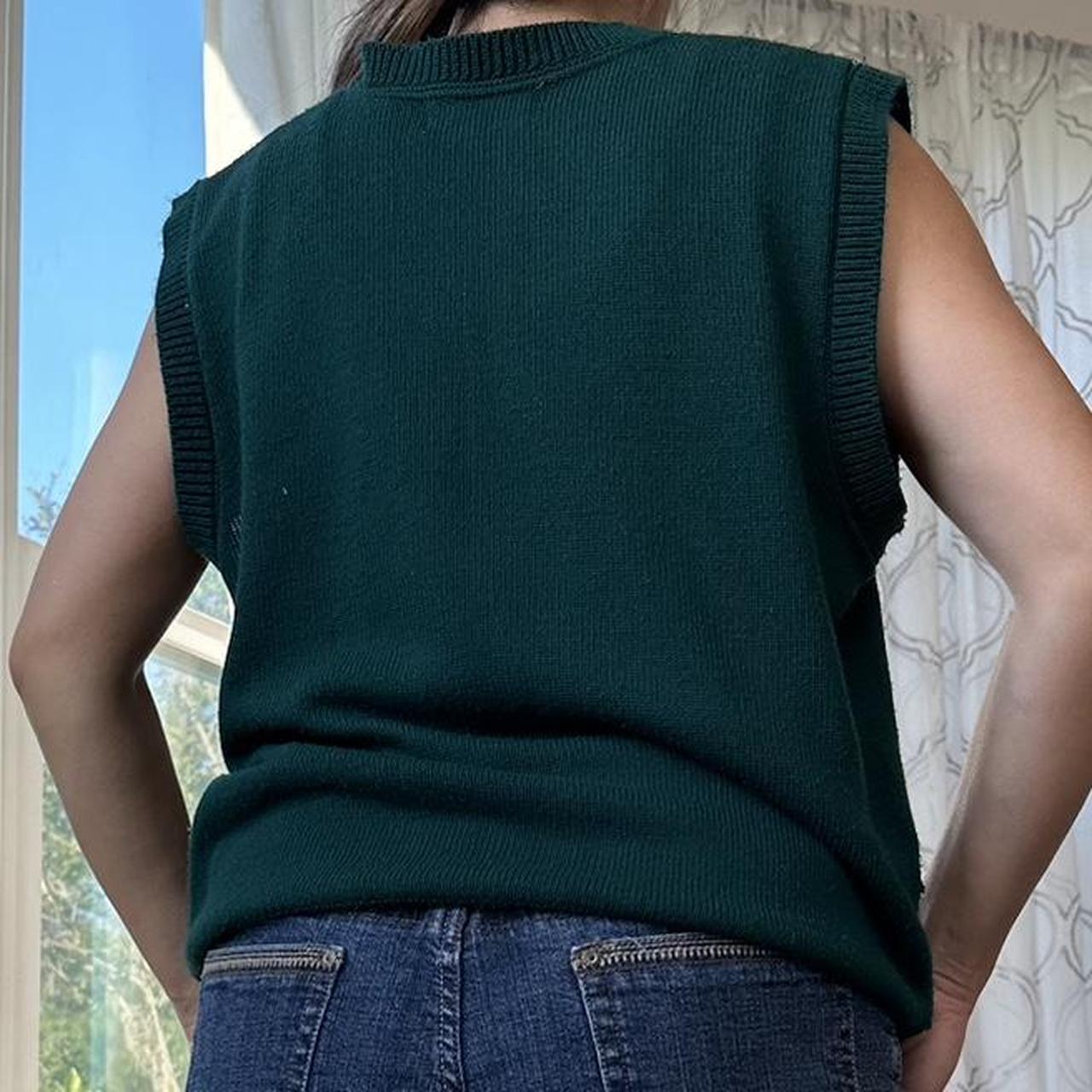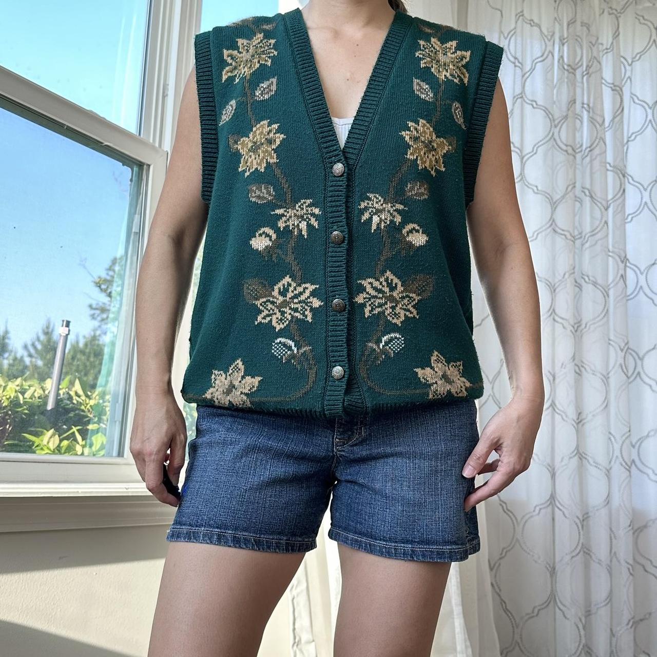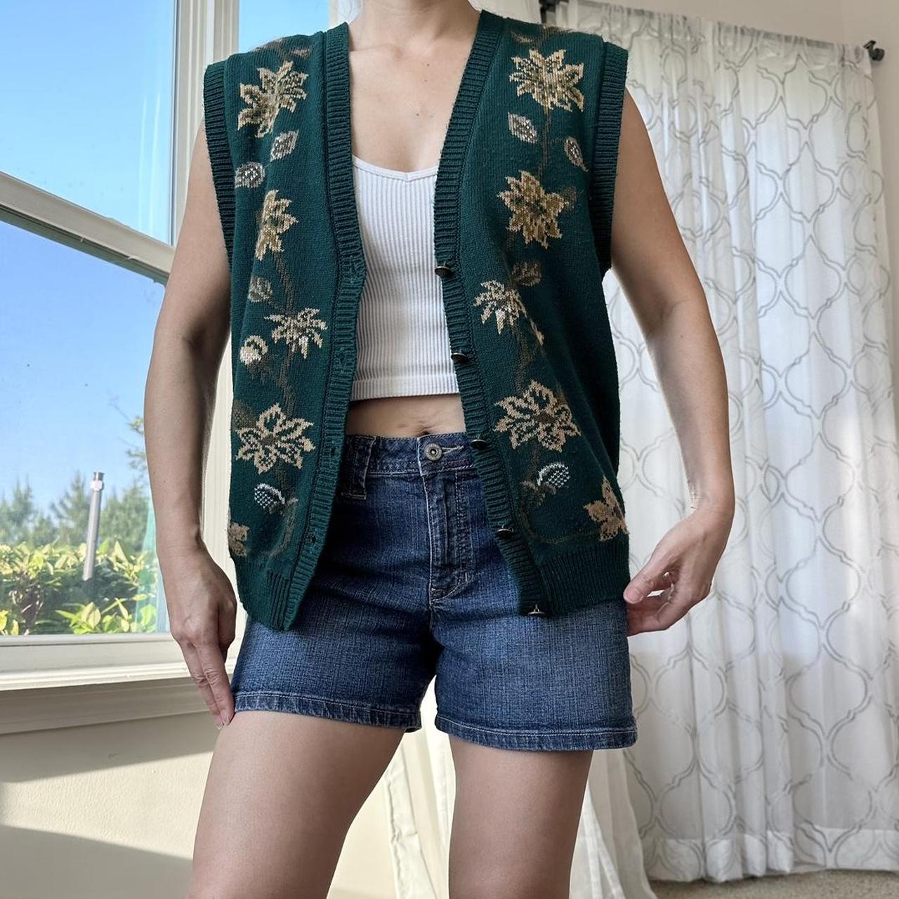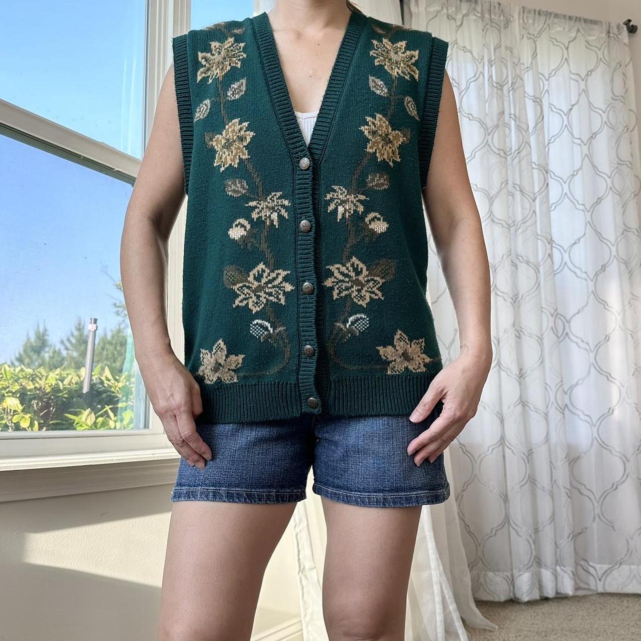 Forest green floral vest with additional colors of tan, muted olive green, and white.