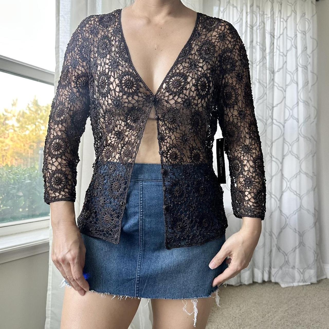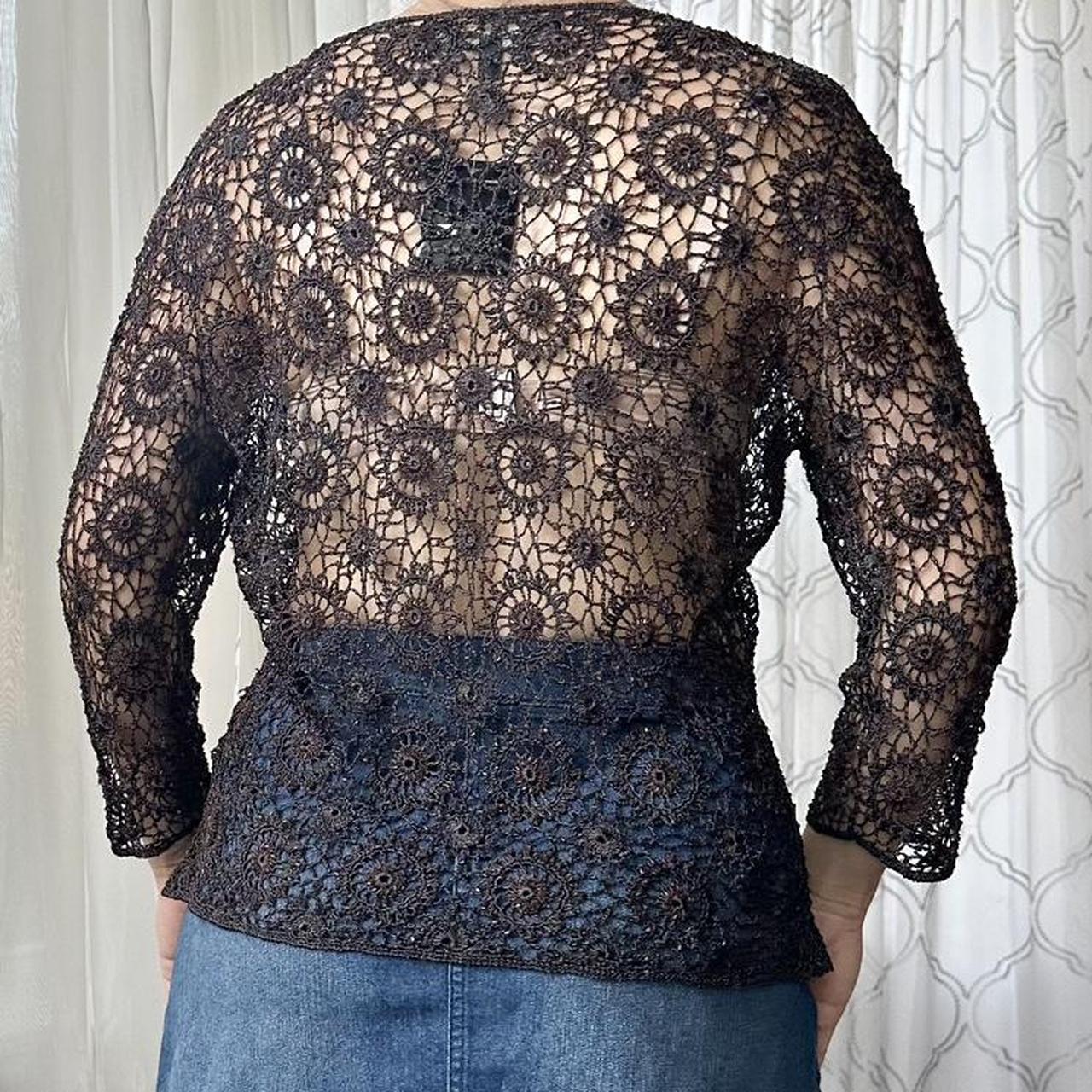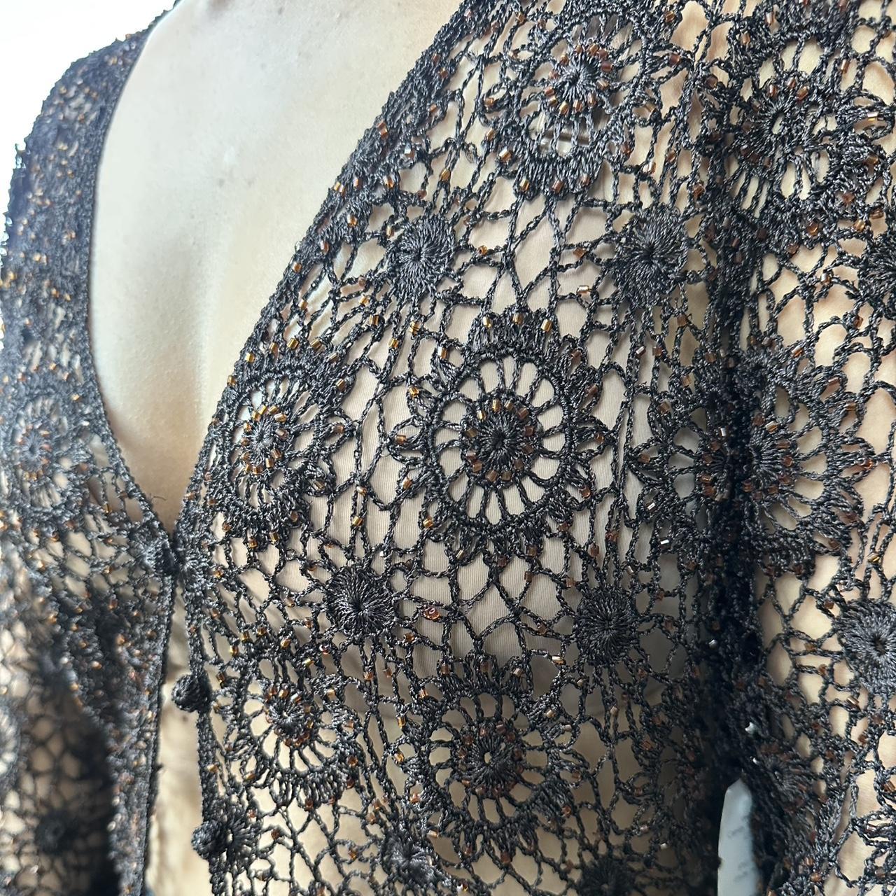 Brown knitted floral top with contrasting caramel colored beadwork.