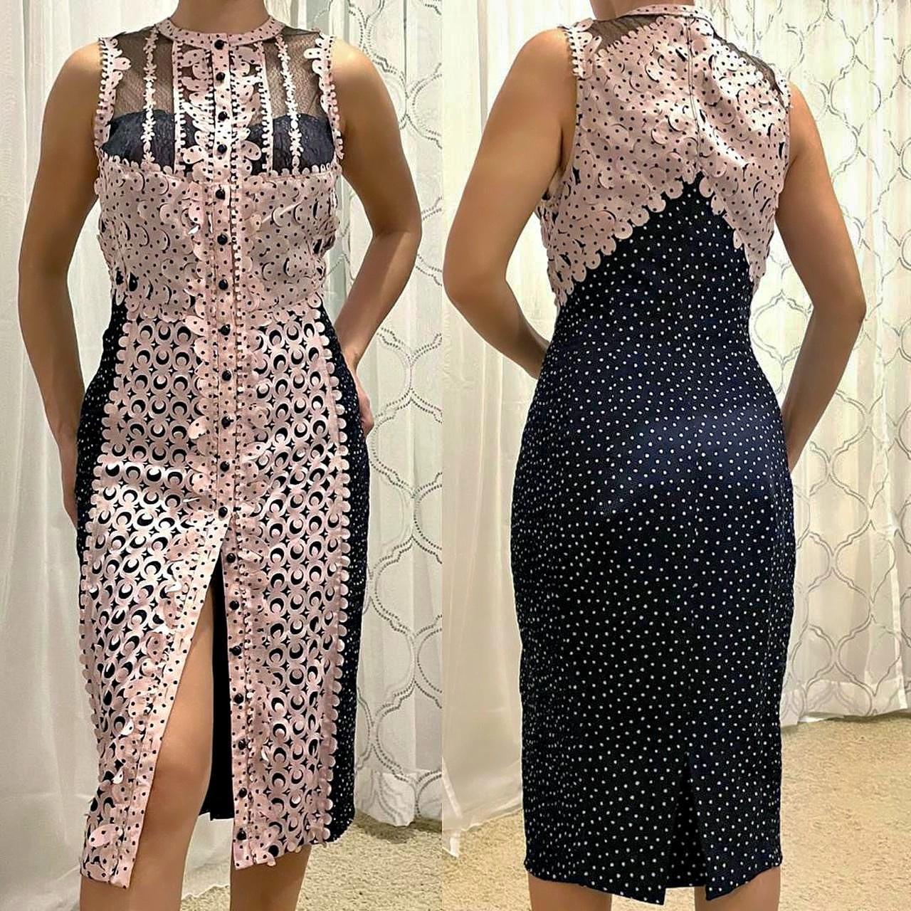 Deadstock. Beautiful laser cut dress in navy and pink. Elastic ruching along the sides give that hug, showing off your voluptuous curves.