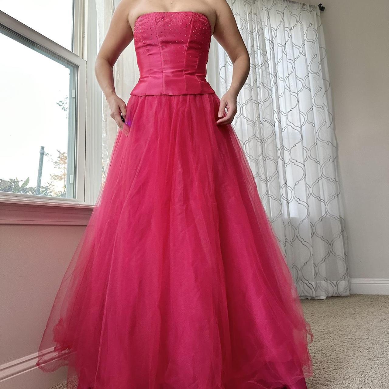 Vintage two piece strapless corset ball gown in a magenta pink. Corset is adorn with clear & tones of pink rhinestones.