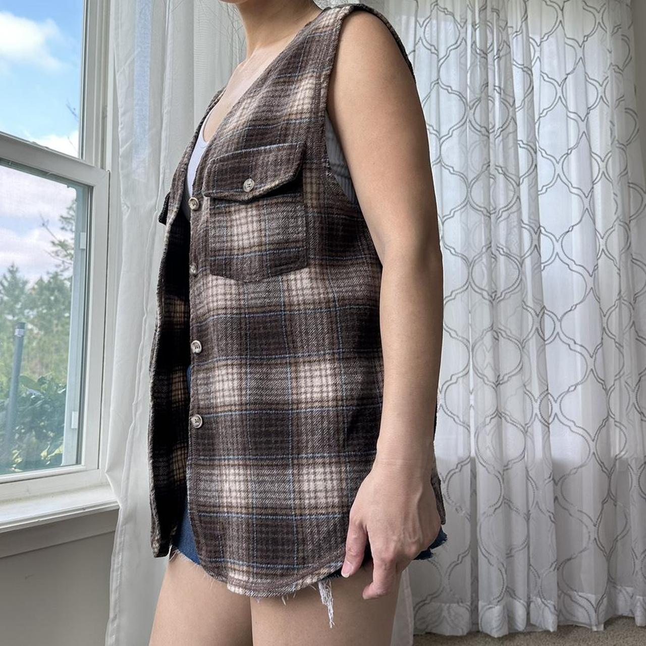 Vintage plaid vest in colors of baby blue, orange, cream, & tones of brown, from dark to light.